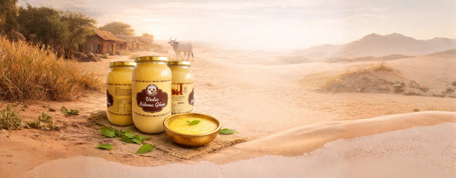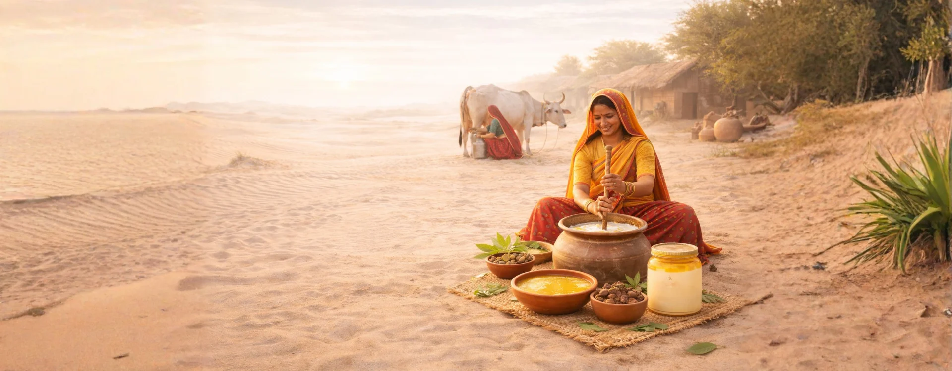 The milk is not ordinary—it carries the essence of the desert. To preserve this, we follow the traditional Vedic Bilona process, where milk is first turned into curd, then hand-churned, and finally slow-cooked over cow dung fire. This method ensures that the natural properties, aroma, and nutritional value remain intact.